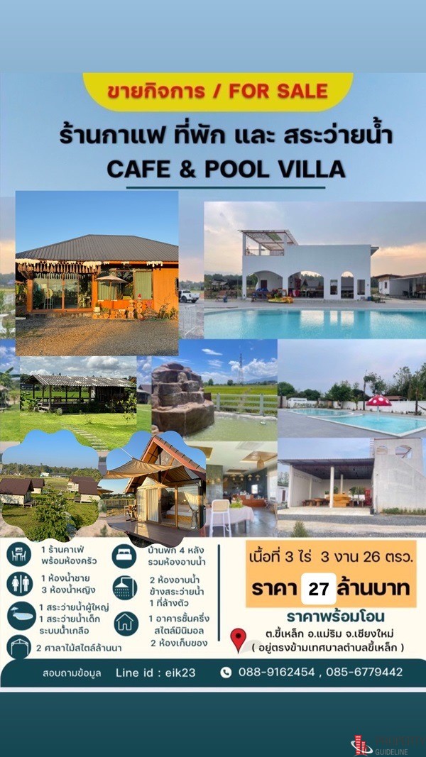 ขายอื่นๆแม่ริม ขายกิจการร้านกาแฟ สระว่ายน้ำ วิลล่า 4 หลัง อ.แม่ริม จ.เชียงใหม่ พร้อมบริหารกิจการต่อได้เลย โทร 088-9162454